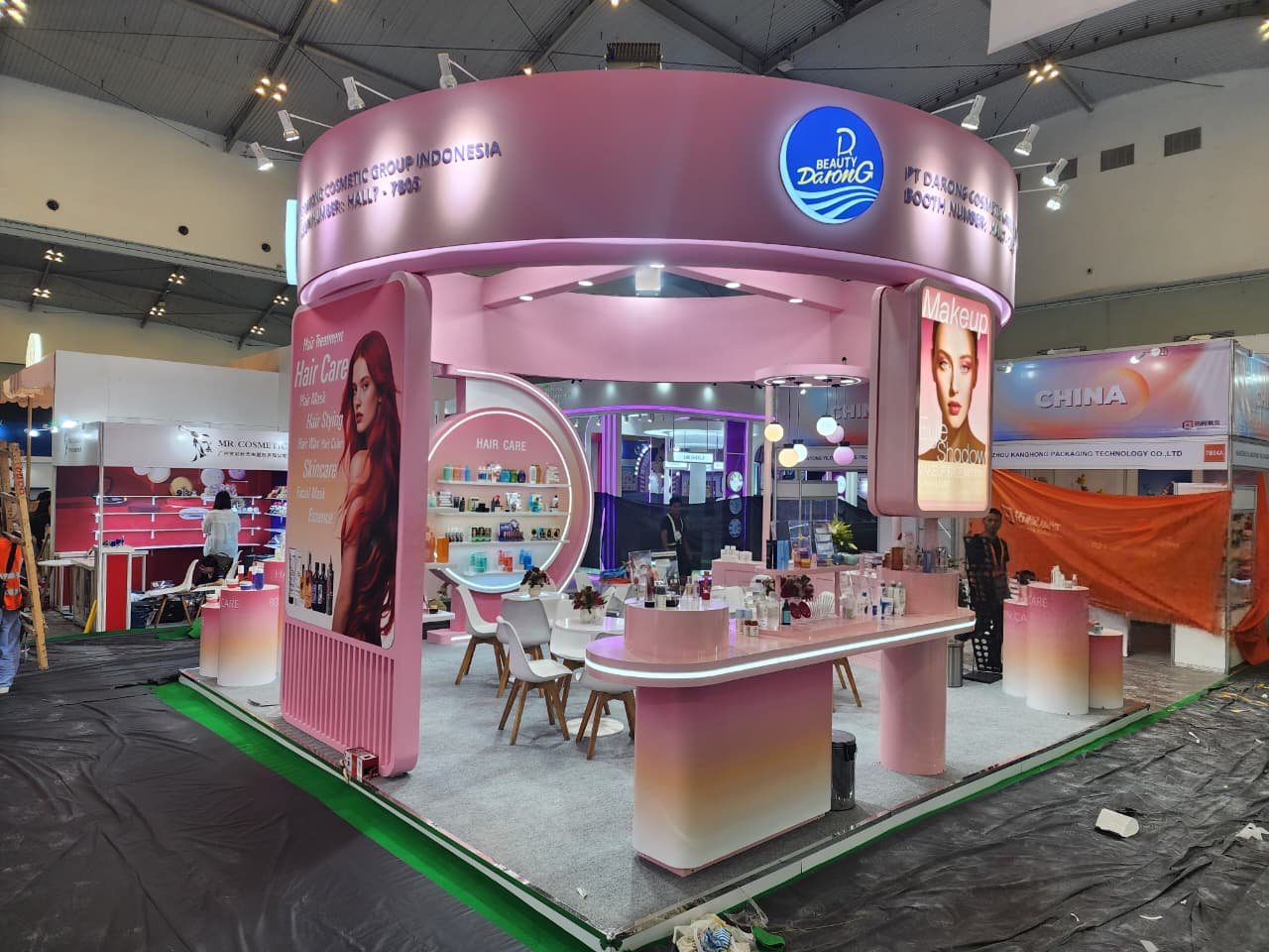 Selain menonjol dari sisi estetika, booth ini juga dirancang dengan mempertimbangkan aliran pengunjung dan kenyamanan interaksi. Area konsultasi dibuat terbuka namun tetap privat, memungkinkan tim Darong Beauty berkomunikasi dengan pengunjung secara efektif. Setiap elemen dekorasi, dari pencahayaan hingga penempatan produk, dirancang untuk menciptakan pengalaman brand yang imersif dan menyenangkan.