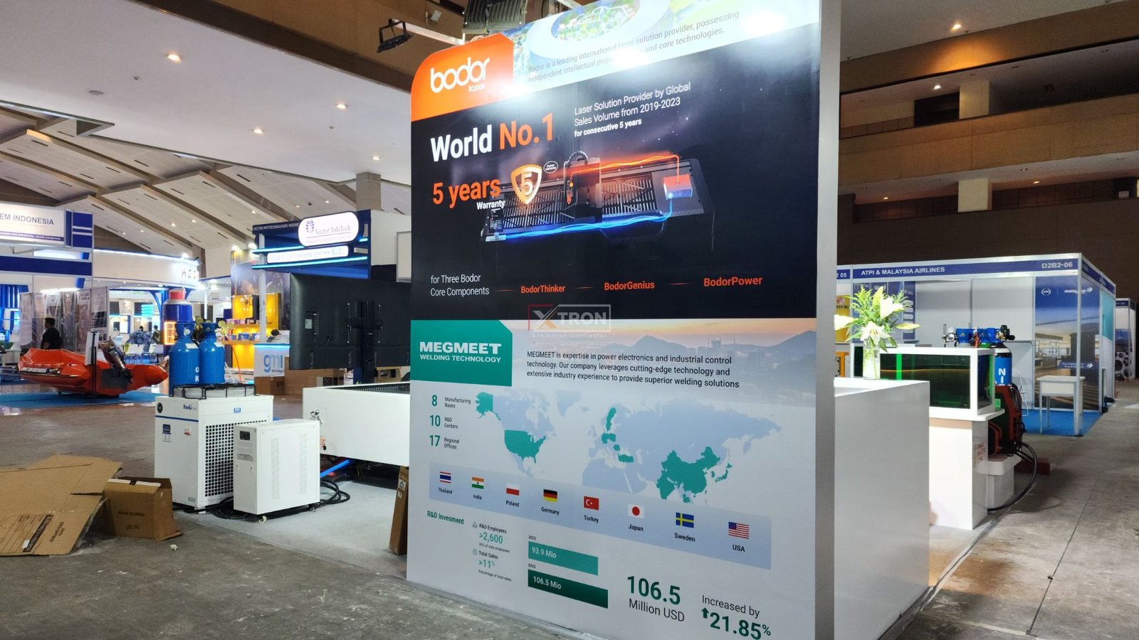 Desain booth mengusung konsep industrial modern yang menonjolkan kekuatan brand Synergis. Elemen-elemen modular kami gunakan untuk memungkinkan proses instalasi yang efisien serta fleksibel saat pengaturan ulang layout. Setiap detail dirancang agar mendukung display mesin-mesin berat seperti laser cutting Bodor dan sistem pengelasan Megmeet, sekaligus tetap nyaman untuk area interaksi pengunjung.