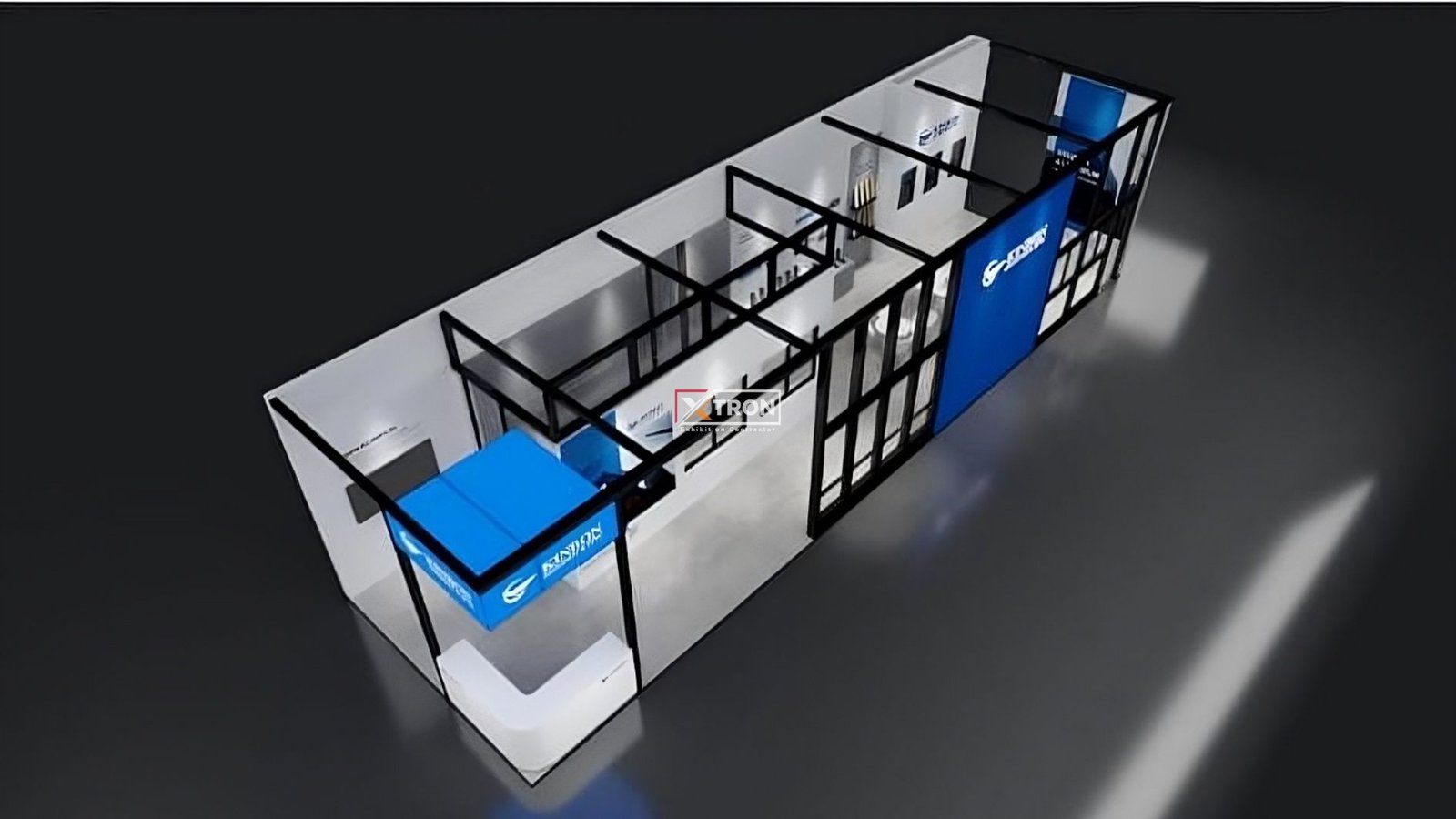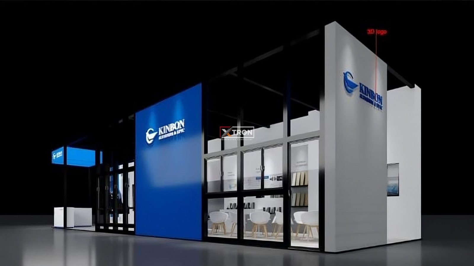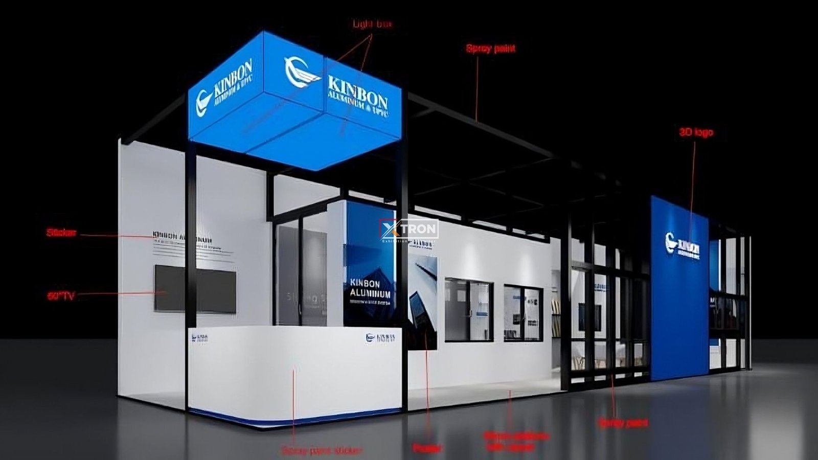 Booth Kinbon memadukan konsep desain minimalis modern dengan struktur rangka hitam yang tegas dan fasad kaca yang terbuka. Hal ini menonjolkan produk-produk aluminium secara langsung, menghadirkan pengalaman pameran yang bersih, elegan, dan profesional. Didukung pencahayaan LED yang dipasang strategis, booth ini mampu menarik perhatian pengunjung dari kejauhan. Dominasi warna putih dan biru menegaskan citra premium dan korporat yang kuat sesuai identitas Kinbon.