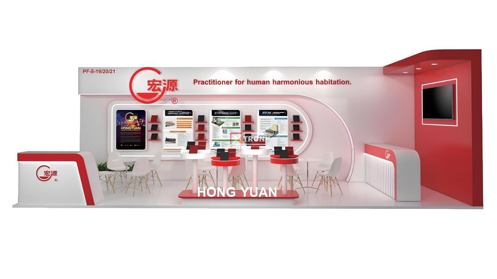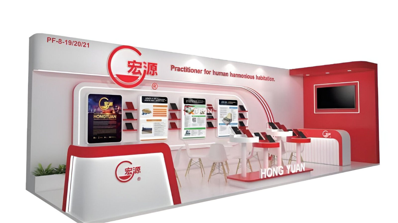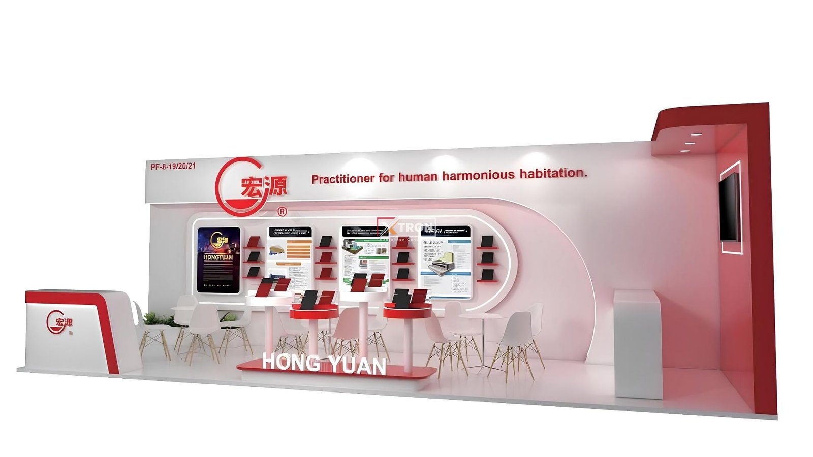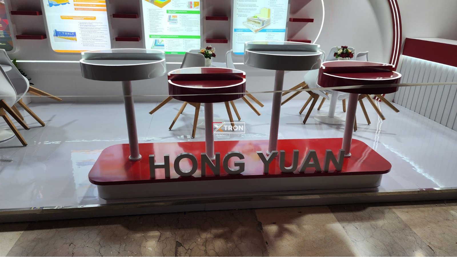 Gambar-gambar hasil jadi menunjukkan booth Hongyuan dengan penataan rapi, pencahayaan profesional, dan tampilan visual yang informatif dan memikat.