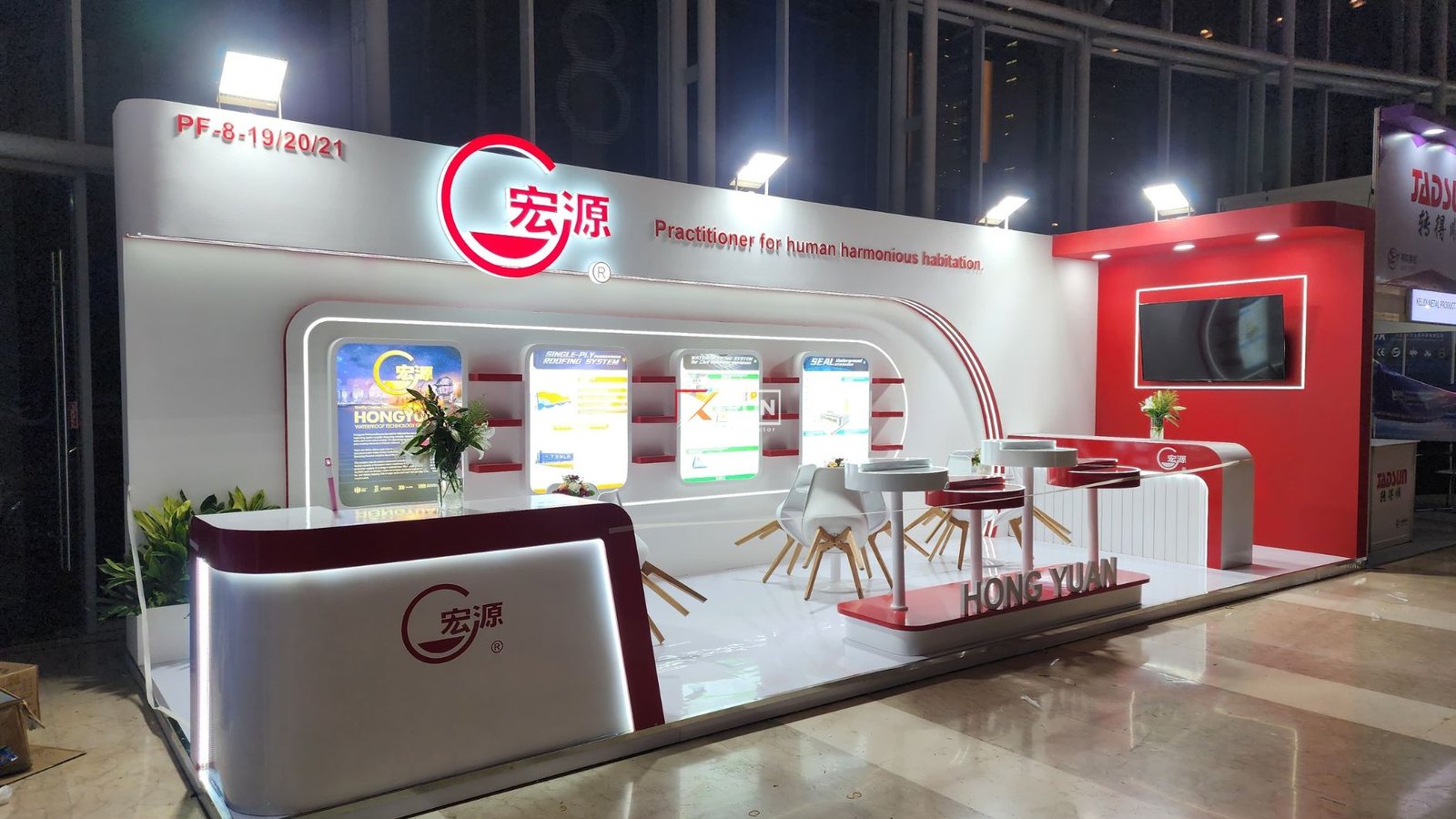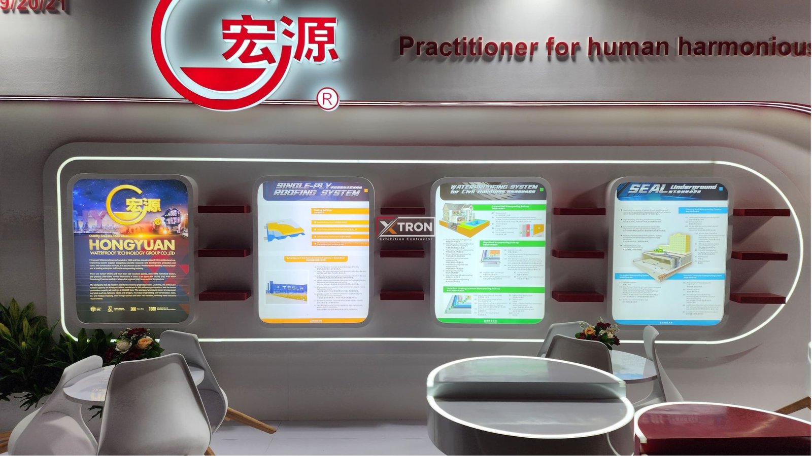 Dengan ukuran 3 x 9 meter, booth Hongyuan dirancang untuk menampilkan kesan profesional, bersih, dan informatif. Konsep desain disesuaikan dengan karakter brand Hongyuan yang bergerak di bidang teknologi sistem waterproofing, agar pengunjung mudah memahami keunggulan produknya.