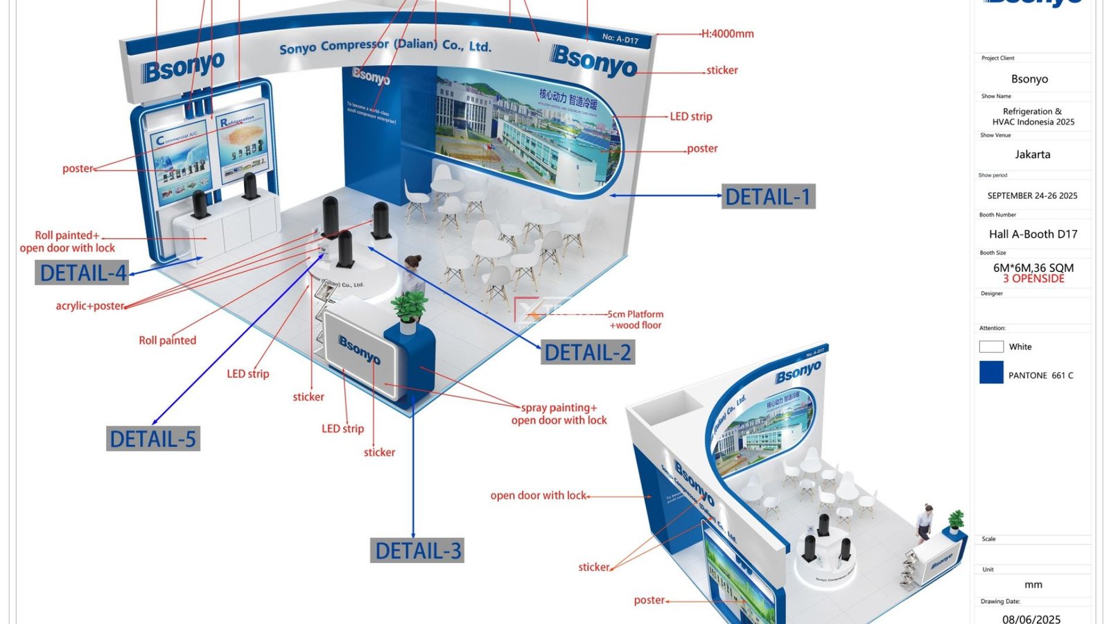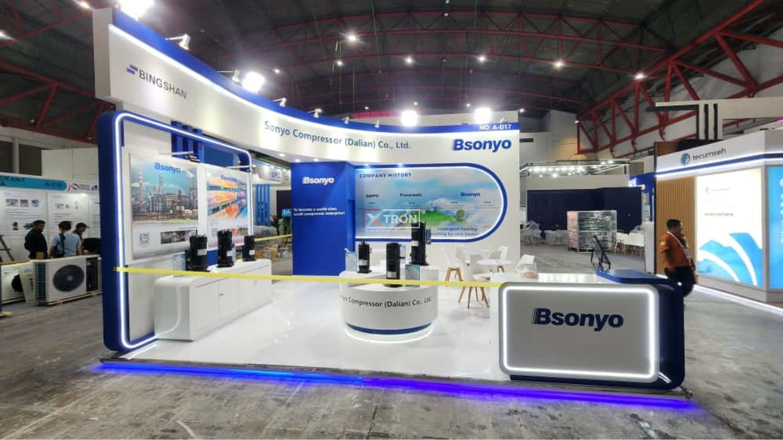 Booth berukuran 6×6 meter ini dirancang dengan konsep modern dan profesional, menonjolkan identitas merek Bsonyo yang inovatif di bidang teknologi kompresor. Desainnya memadukan elemen warna biru dan putih, menciptakan kesan bersih, elegan, dan berteknologi tinggi. Area penerimaan dan display produk diatur dengan tata cahaya LED lembut, menonjolkan detail setiap unit kompresor yang dipamerkan.