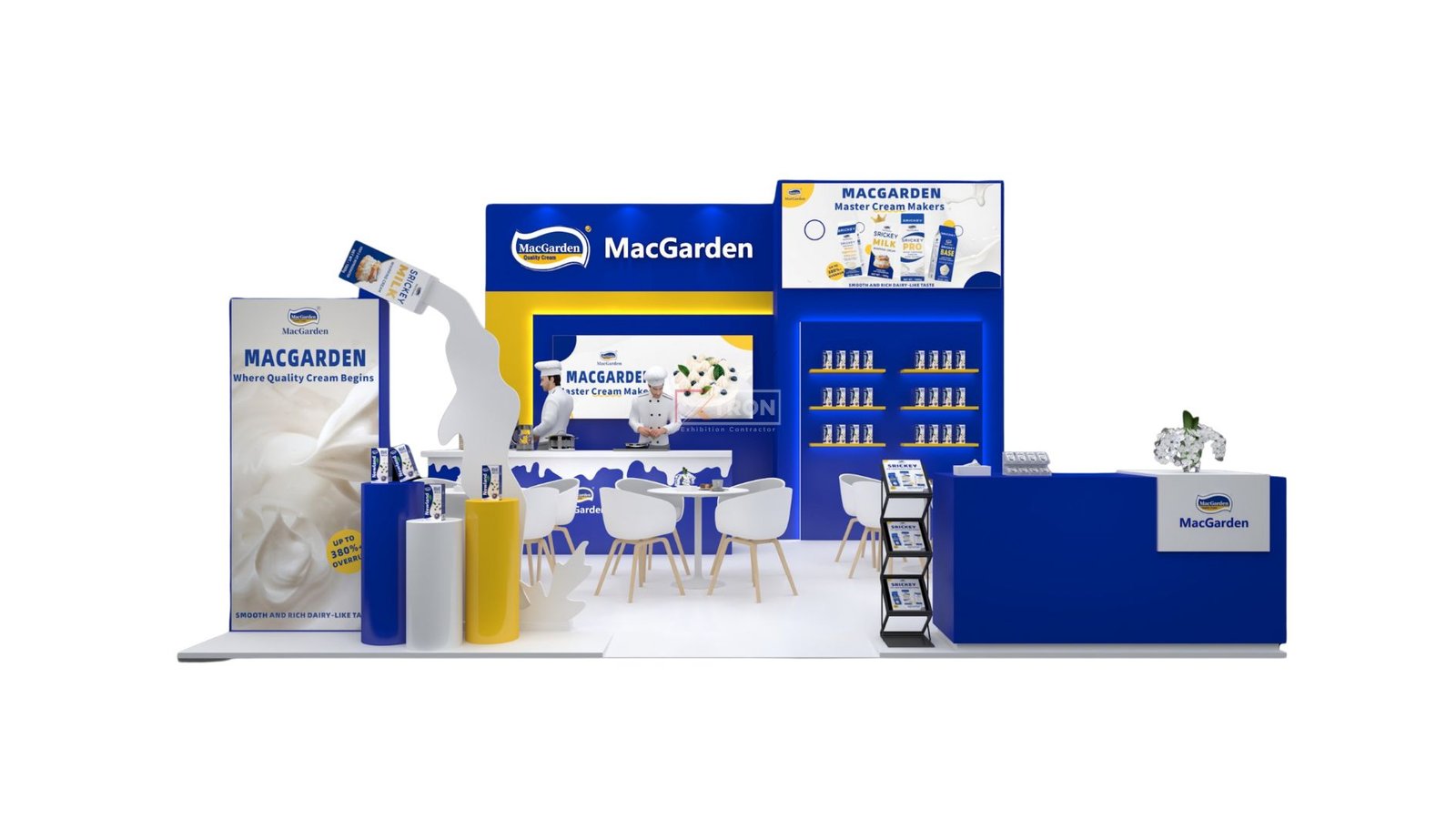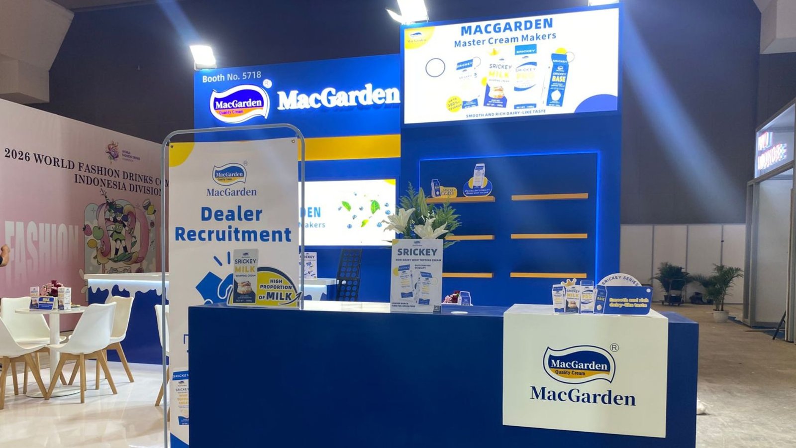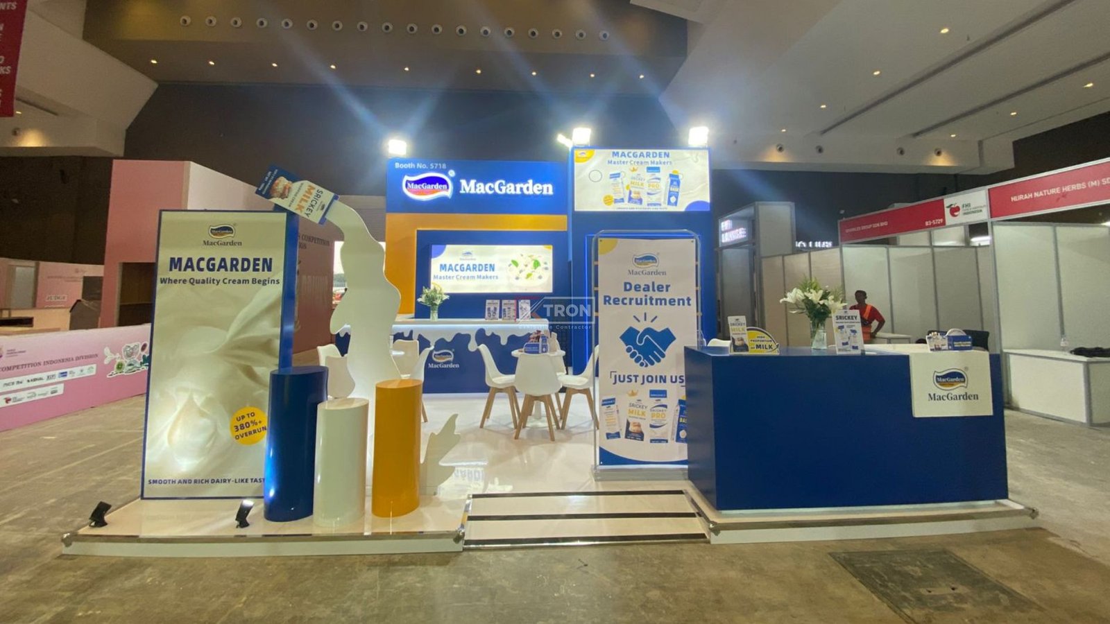 Booth MacGarden, yang berukuran 6×6 meter, mengusung konsep modern, bersih, dan komunikatif. Warna biru dan kuning khas brand digunakan untuk menciptakan kesan profesional namun tetap bersahabat. Tampilan booth didesain menyatu dengan media promosi digital yang memperkuat pesan dan identitas visual.