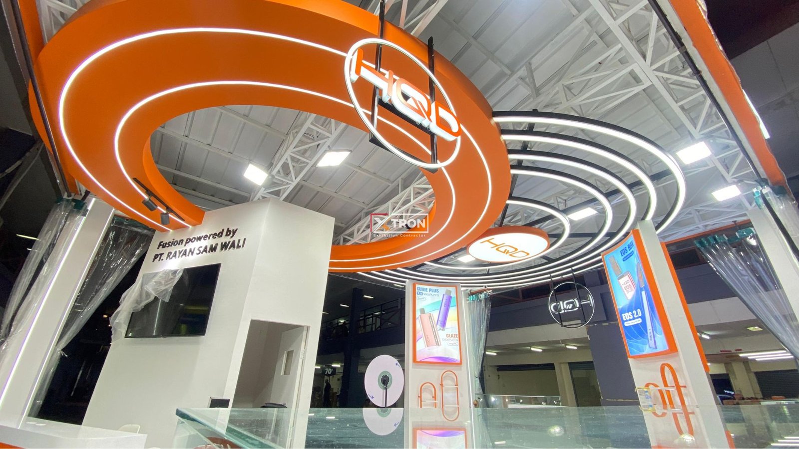 Sebagai vendor pameran, kami memahami bahwa desain booth harus mampu menarik perhatian pengunjung. Tidak hanya itu, desain juga perlu memberikan pengalaman yang berkesan. Struktur Booth HQD didominasi oleh ornamen plafon melingkar dengan lighting LED. Elemen ini dirancang khusus untuk menciptakan kesan futuristik dan elegan.