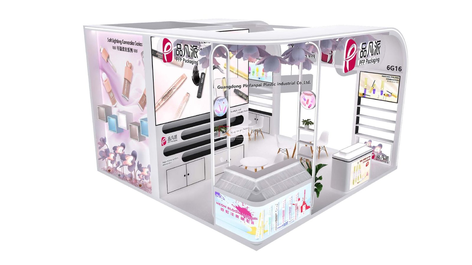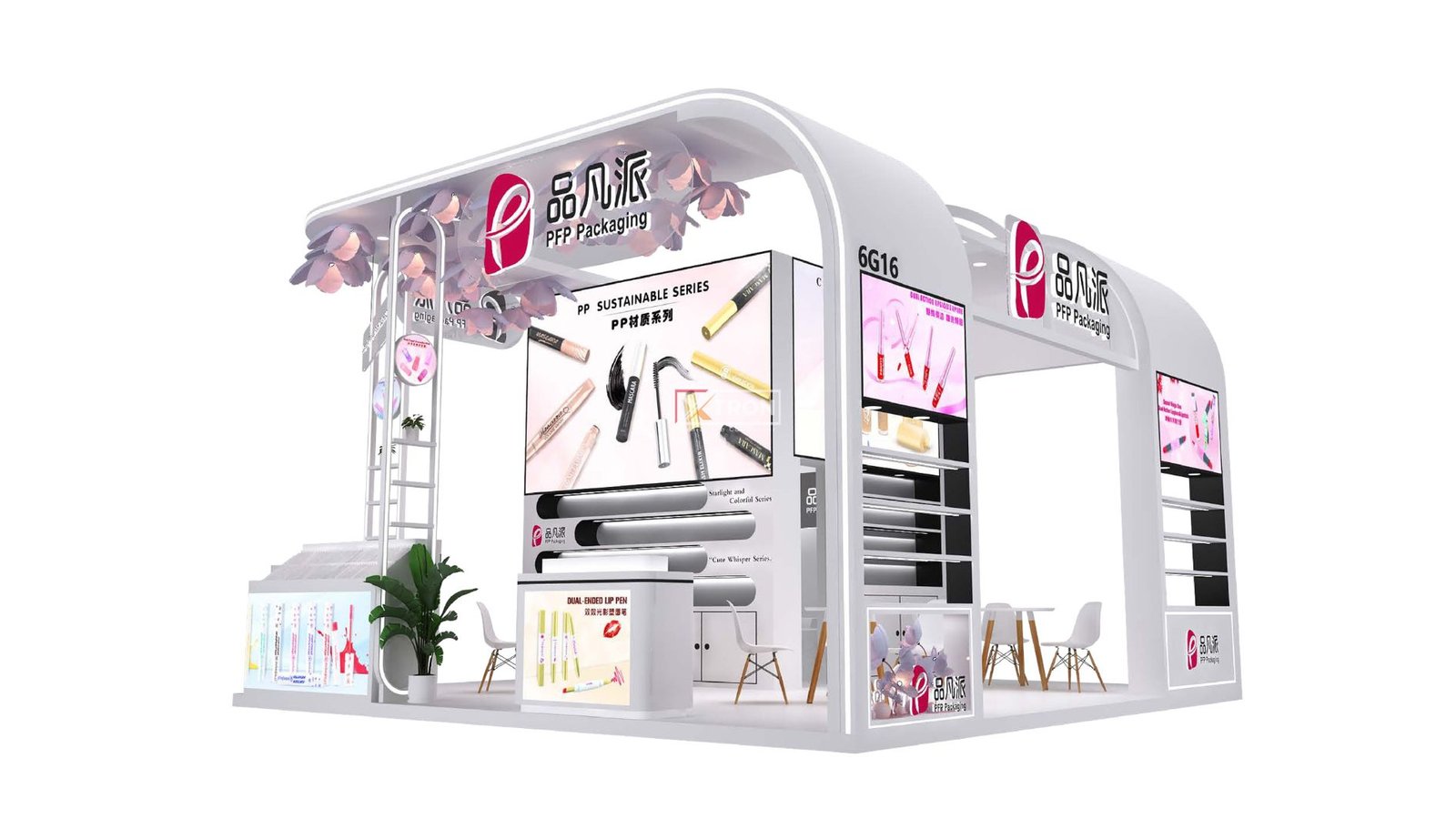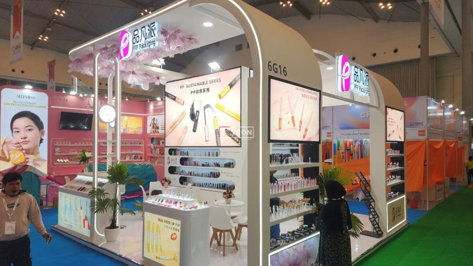 Dengan ukuran 6×6 meter, desain booth PFP Packaging tampil menonjol berkat kombinasi warna putih yang elegan, pencahayaan LED modern, serta tata ruang yang memudahkan interaksi pengunjung. Area display yang rapi menampilkan berbagai produk kemasan kosmetik dengan tampilan premium, menegaskan identitas brand yang inovatif dan profesional.